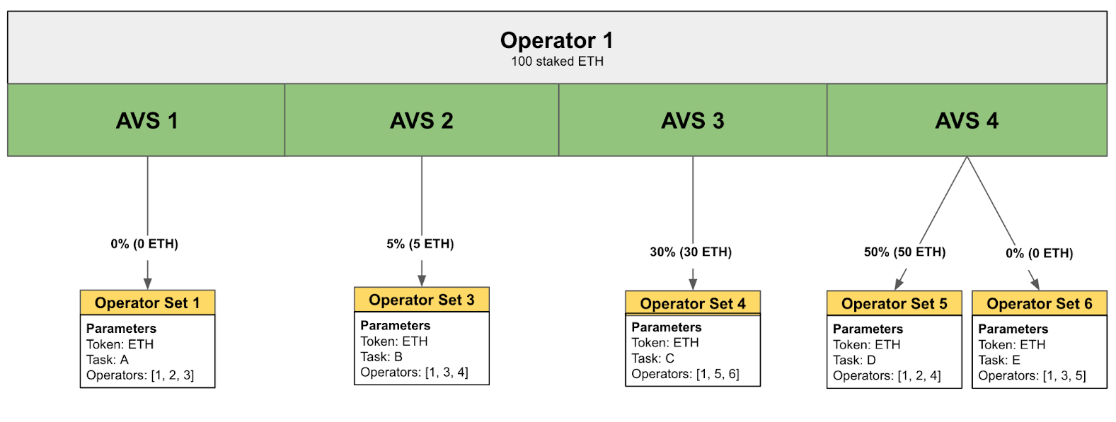Operator 1 has a delegation of 100 staked ETH. Operator 1 allocates proportions of that ETH as Unique Stake in Operator Sets across several AVSs. The 85 allocated ETH is slashable exclusively by the AVS for each Operator Set. That is, AVS 2, 3, and 4 can slash their associated Operator Sets 3, 4, 5, and 6 respectively.
